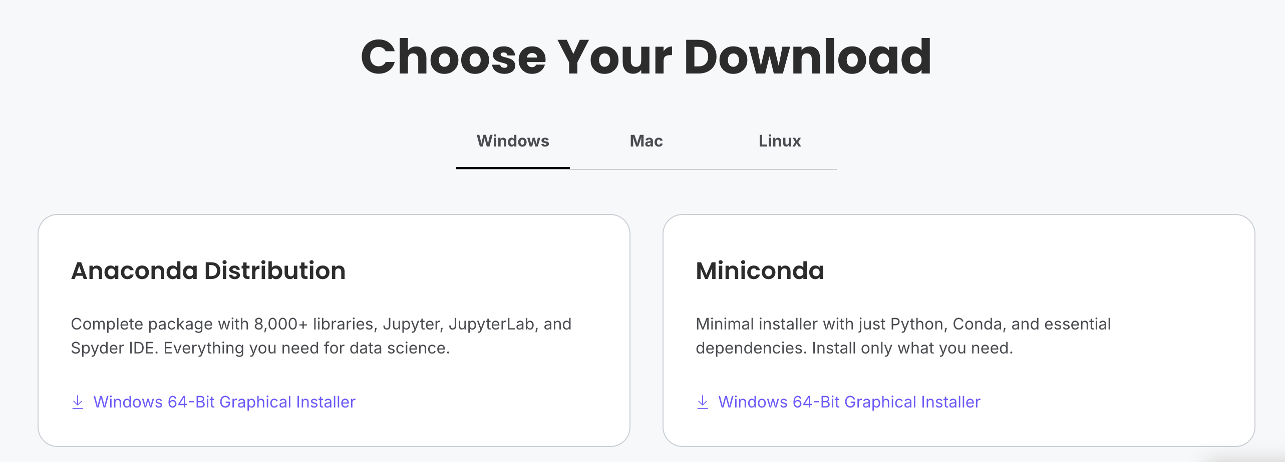 - Download the installer for your operating system: - Windows: Download the .exe installer (Select “64-Bit Graphical Installer”) - macOS: Download the .pkg installer (Select “64-Bit Graphical Installer”) - Linux: Download the .sh installer